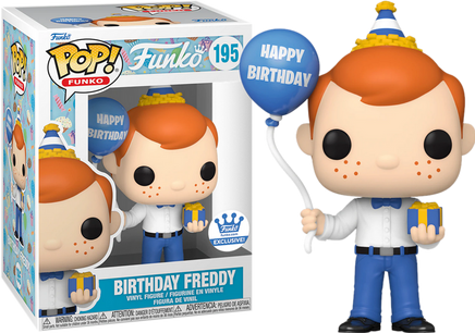 Celebrate with Funko Exclusive Pop! Birthday Freddy Funko! If there's one thing you should know about Freddy, it's that he's a fan of everything, especially birthday parties. Make this Birthday Freddy Funko Pop! the perfect companion for enjoying a delicious slice of cake. He’s all decked out in his party hat, blue bowtie, and he’s bringing a lovely present and blue balloon that says Happy Birthday.